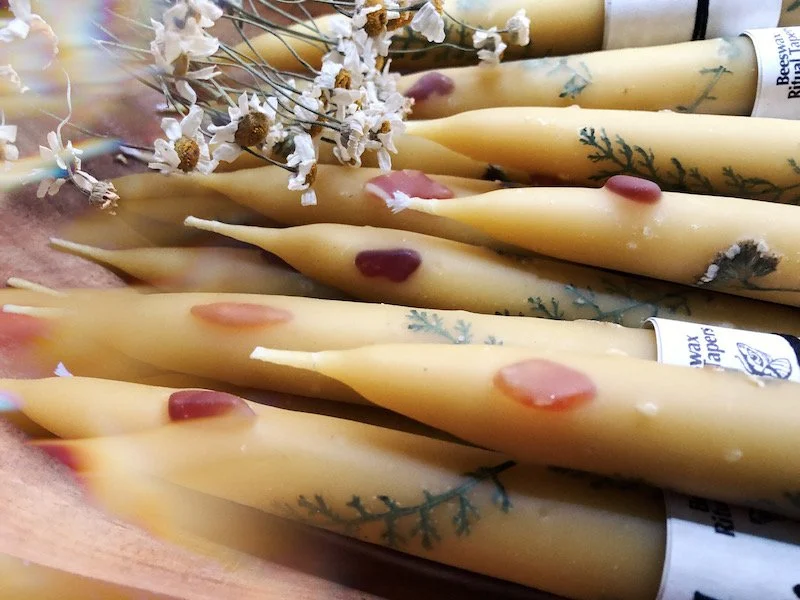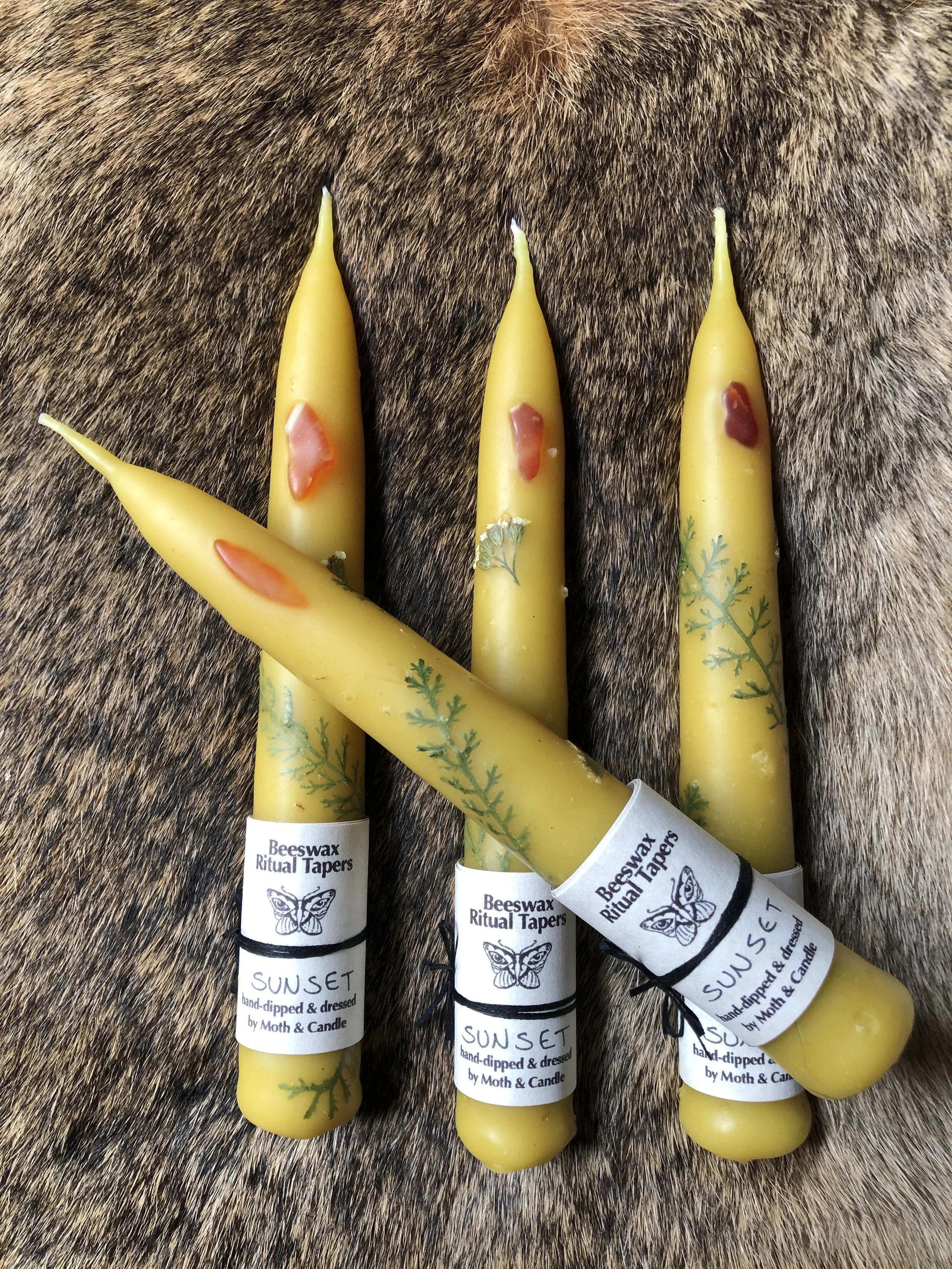 I am so happy with the way these tapers turned out. The roasted seashell and myrrh fragrance just lightly permeates the air as they burn. The gold flake shimmers gently off the details of the embedded flowers as the flame makes its way down the taper. One of the reasons I love making candles is for the experience that happens during the burning of the candle. The atmosphere it will create. These tapers definitely emanate an atmosphere of luxury and magic.